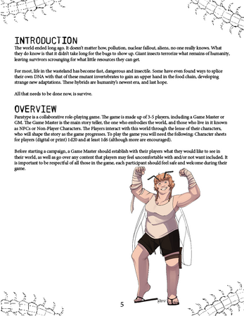 Paratype is a collaborative role-playing game. The game is made up of 3-5 players, including a Game Master or GM. Included are character sheets and a 32 page handbook on how to play. Enter a post-apocalyptic world and fight giant bugs to gain strange new abilities.